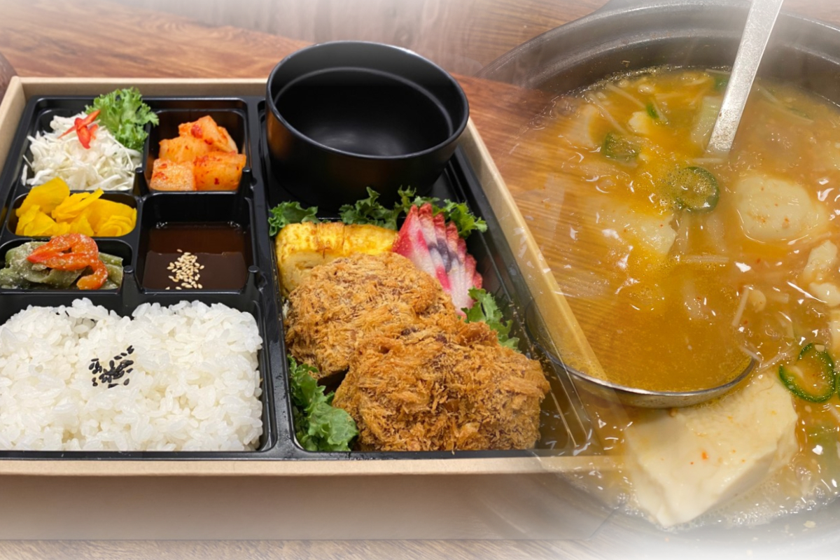 아침에 미리 우려낸 진한 된장 육수로 뚝배기째 끓여내는 순두부 된장찌개와 돈까스가 같이 나와 돈가스 백반이 됩니다.